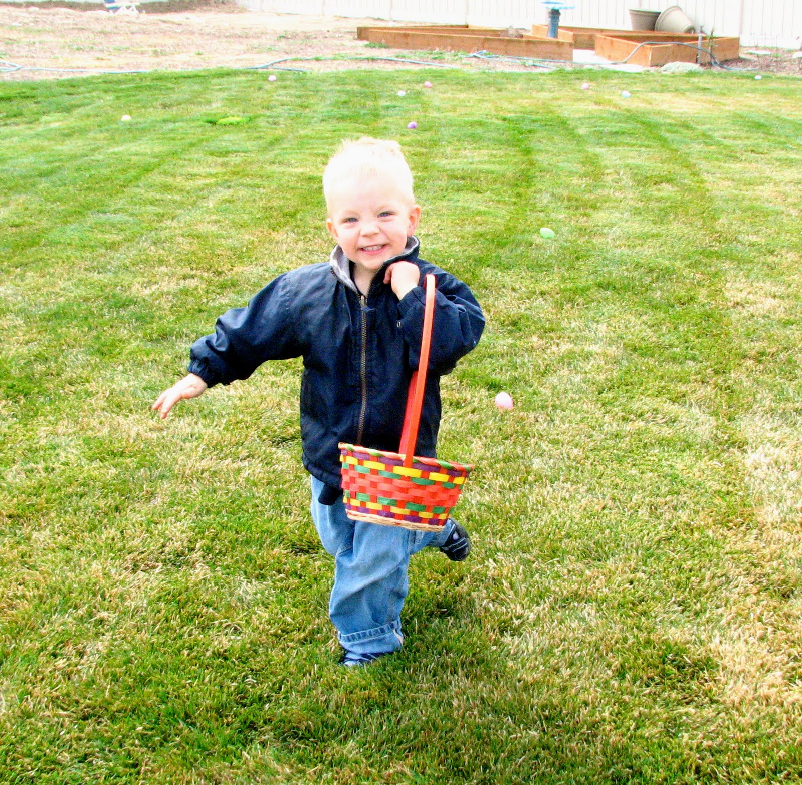 This is what we woke up to Easter morning. YUCK!! I did have one tulip bloom today though.I made my Christmas cinnamon(Sp?Can't figure out spellcheck on our new computer!!) rolls for Easter. Thought I would start a new tradition of having them twice a year instead of just one. Because of the weather we did a Easter egg hunt in the playroom and I set out their baskets on their bed. Towards the afternoon it got a little warmer so we did another hunt outside. Apparently my kids thought it was in the middle of summer by the shorts and bare feet. I had my nephew over to take in on the fun, too. The kids (aka Aubree) also got a bug catcher set (don't take your kids to Costco!) I told her she had to wait for Easter.